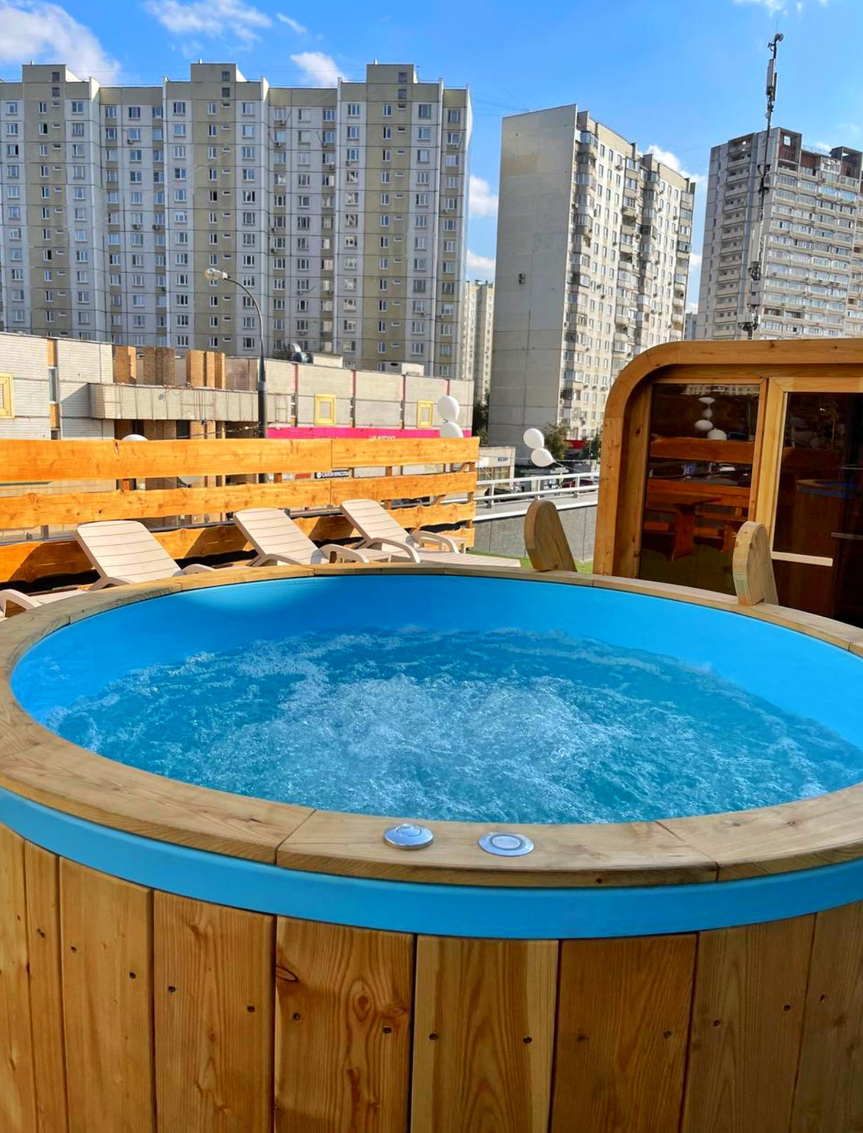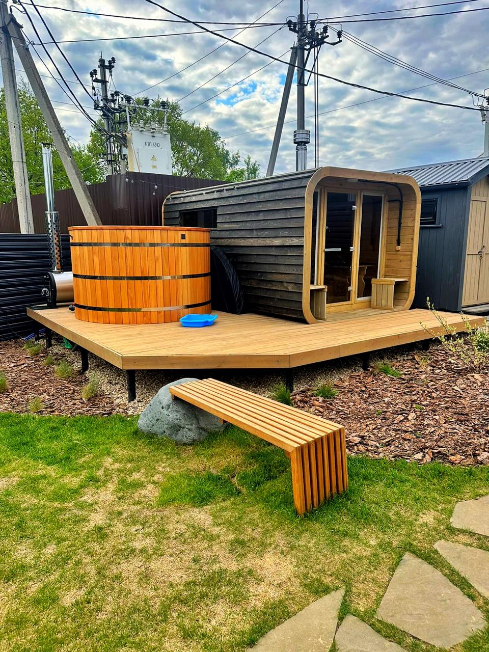 • Купель для двоих• Обшивка планкеном лиственницы• Дровяная печь • Боковой слив